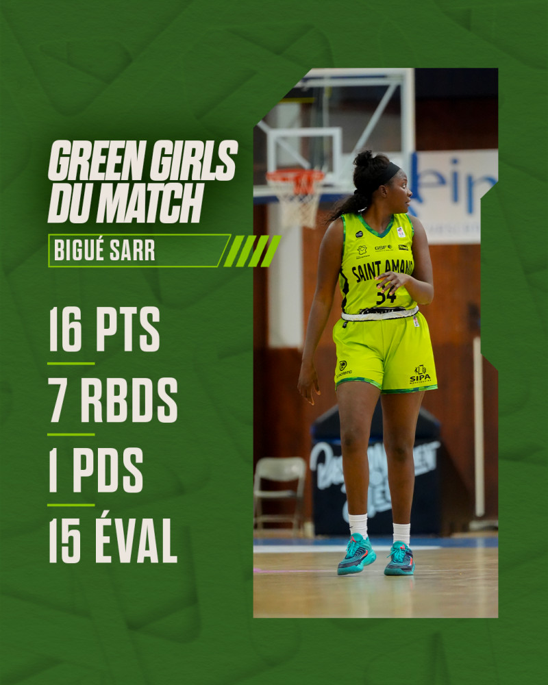 Bigué Sarr est élue Green Girls du match, elle cumule 𝟭𝟲 𝗽𝗼𝗶𝗻𝘁𝘀, 𝟭 𝗽𝗮𝘀𝘀𝗲, 𝟳 𝗿𝗲𝗯𝗼𝗻𝗱𝘀, 𝗽𝗼𝘂𝗿 𝟭𝟱 𝗲́𝘃𝗮𝗹𝘂𝗮𝘁𝗶𝗼𝗻𝘀 !